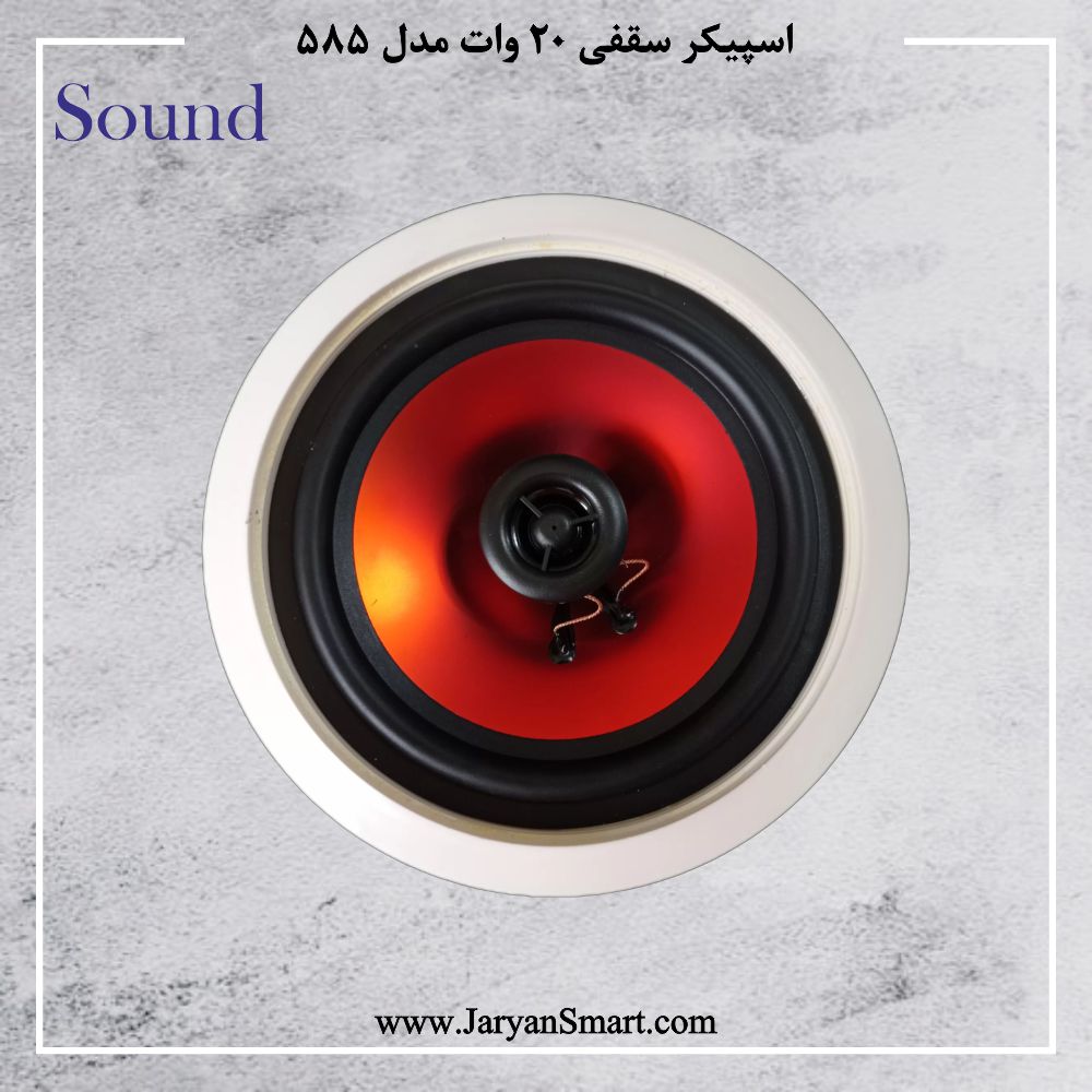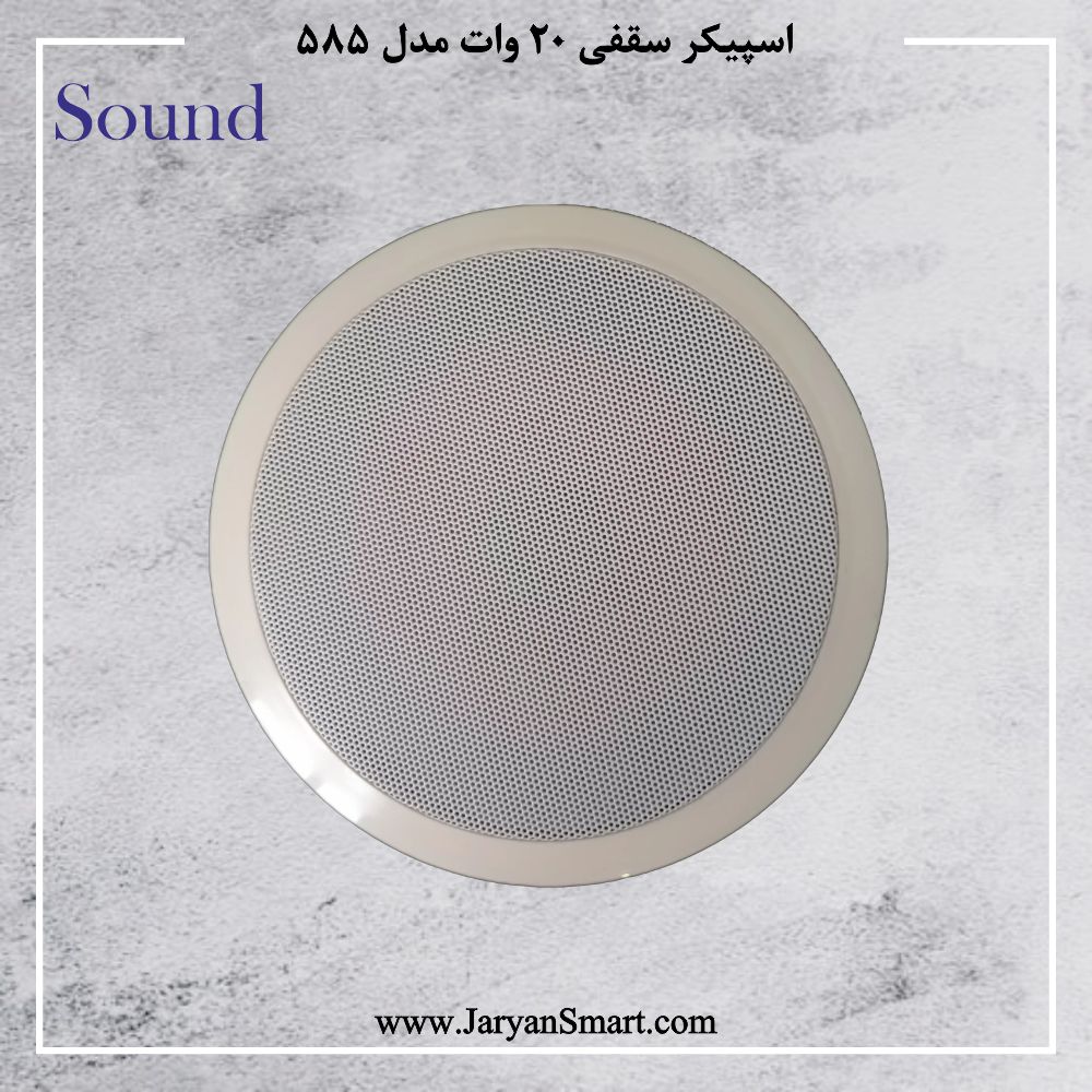 اسپیکرهای سقفی دسته‌ای از اسپیکرها هستند که برای نصب داخل سقف‌های کاذب طراحی و تولید شده‌اند. این نوع اسپیکرها با توجه به مشخصه‌هایی که دارند، برای فضاهای متنوع با حجم و کیفیت متفاوت صدا مناسب می‌باشند. در فضاهایی مانند سالن پذیرایی، اتاق‌های نشیمن و خواب، سرویس بهداشتی، استخر، دفاتر کار، مغازه‌ها، رستوران‌ها، مدارس و… می‌توان آن‌ها را به راحتی در سقف‌های گچی و کنافی نصب نمود.همچنین این اسپیکر با تکنولوژی پسیو (Passive) با مقاومت 8 اُهم و تکنولوژی 2way (دارای ووفر و تیوتر) می‌باشند. اجزای تشکیل‌دهنده اسپیکرها شامل آهنربا، دیافراگم، تیوتر، بدنه و… میباشد.اسپیکر سقفی 585 با قطر گردبر سقف 16.5 سانتی‌متر، دیافراگم 6.5 اینچی، توان ماکزیمم 50 وات برای سالن‌های پذیرایی، نشمین‌ها، TVroomها و فضاهای داخلی مناسب است. هر اسپیکر قادر است فضایی به مساحت تقریباً 20 مترمربع و به ارتفاع سقف حداکثر 3.5 متر را پوشش دهد.